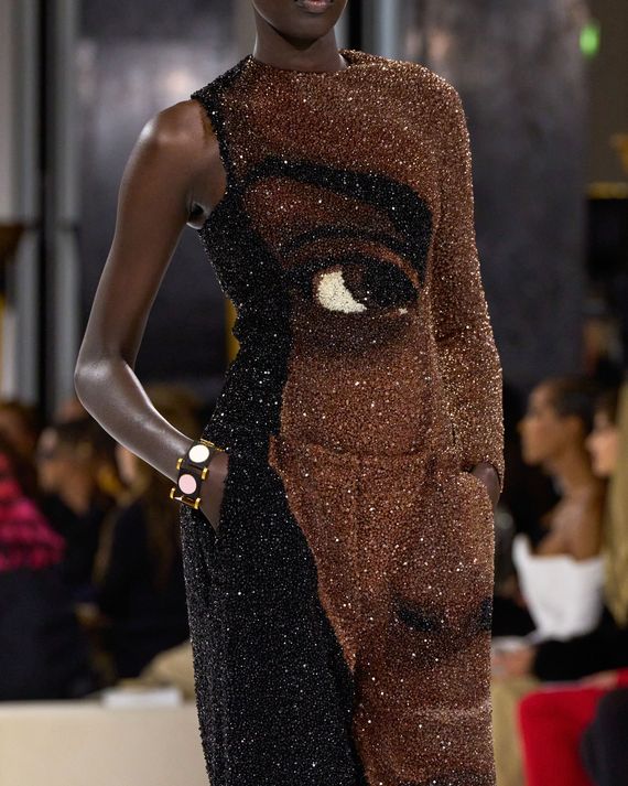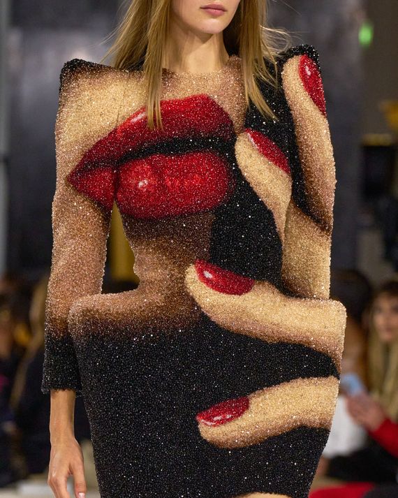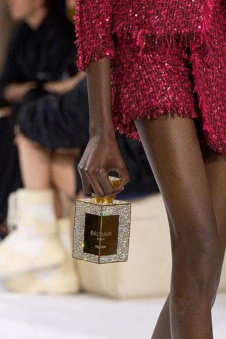 So while I was at Paris Fashion Week attending the Balmain show, I thought to myself, How could a brand like Balmain weave fragrance into a runway show? Well, there was a scent bar at the after-party and life-size bottles of the fragrances, but not at the show. Instead, Rousteing turned his accessories into beauty items: purses in the shape of fragrance bottles, an eyeshadow-palette purse, and lipstick heels. Could he be hinting at his next launch, perhaps? Earlier this year, he told the Cut that makeup is next for Balmain Beauty, but there were no specifics outside of his wanting makeup that is also a hybrid skin-care product.