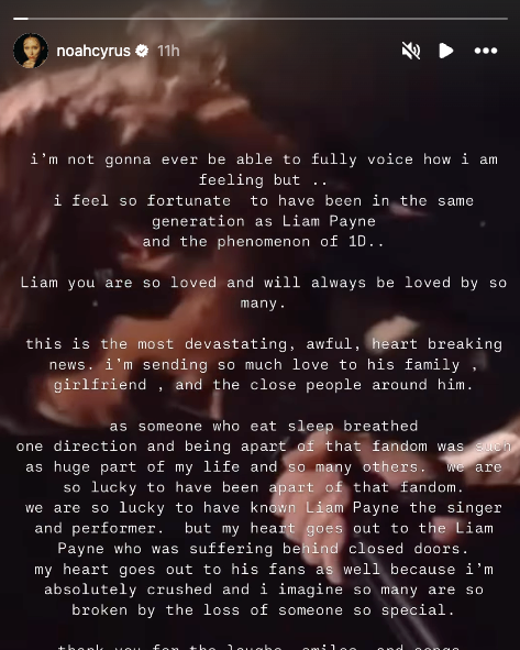 “I’m not ever going to be able to fully voice how I am feeling,” Cyrus wrote in an Instagram Story. “But I feel so fortunate to have been in the same generation as Liam Payne and the phenomenon of 1D. Liam you are so loved and will always be loved by so many.”